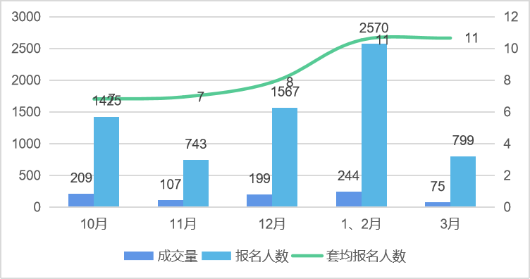 “近半年成交量,報名人數,套均報名人數趨勢圖”