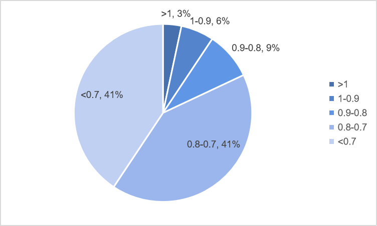 截止至2020年3月31日,北京地區4月上拍的法拍房數量為150套,房屋總價值為123412.259 萬元,150套房子的起拍市價比分布圖如下: