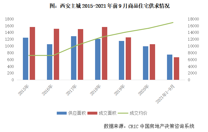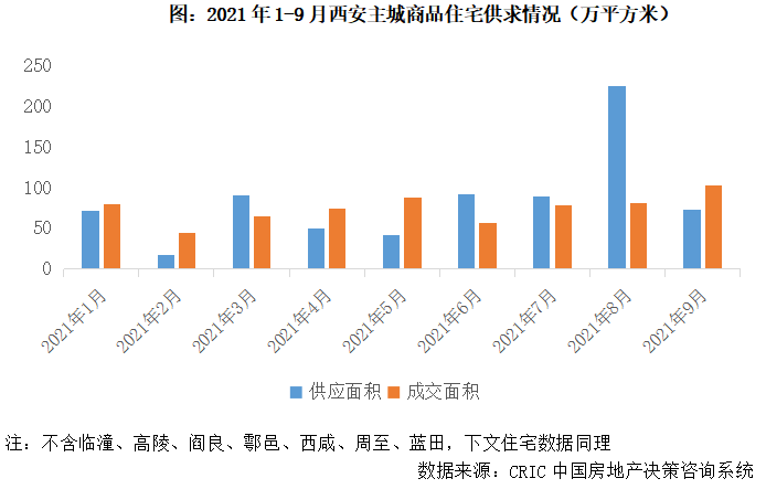 2021年以來,在“330”、“830”兩次調(diào)控加碼之下,西安樓市總體保持平穩(wěn)運行,受制于供應(yīng)縮量,成交相較往年有所回調(diào)。前9月,西安主城區(qū)商品住宅供應(yīng)面積752萬平方米,同比微升5%,較2019年同期下降9%,成交面積674萬平方米,同比下降9%,較2019年同期下降29%。