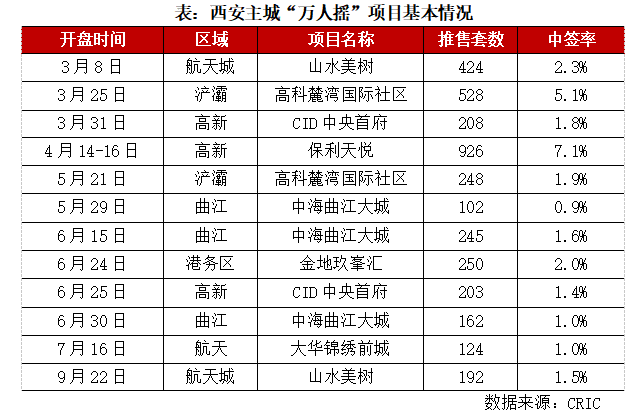 截至9月末,西安樓市出現(xiàn)12次“萬人搖”,中海曲江大城獨攬三次,高科麓灣國際社區(qū)、CID中央首府、山水美樹均兩次上榜。人氣最高的當屬航天城山水美樹項目,共計獲得2.3萬組意向登記,超1.8萬人核驗通過參與搖號,瓜分區(qū)區(qū)424套房源。5月29日開盤的中海曲江大城中簽難度最高,102套房源吸引近1.2萬人搖號,中簽率不足1%。