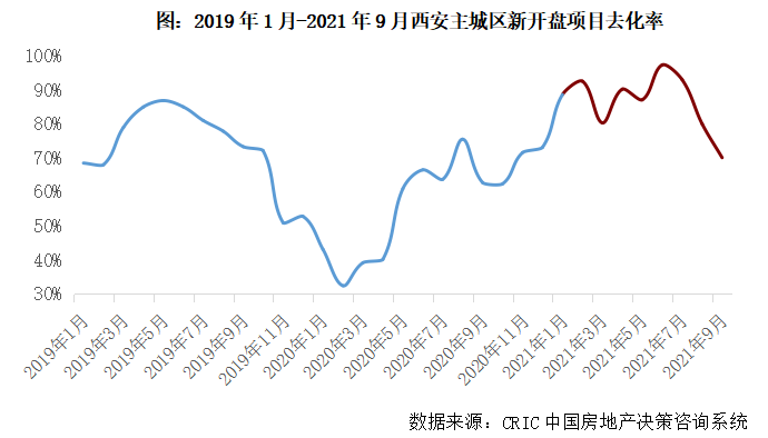 微觀層面,項目銷售表現(xiàn)仍然亮眼,去化率升至近三年來高位。前9月,西安主城區(qū)新開盤項目平均去化率高達88%,較2020、2019年同期分別增長31個百分點和6個百分點,2、6、7月等月份去化率皆在95%左右,意味著當月新入市項目基本都實現(xiàn)開盤即罄。