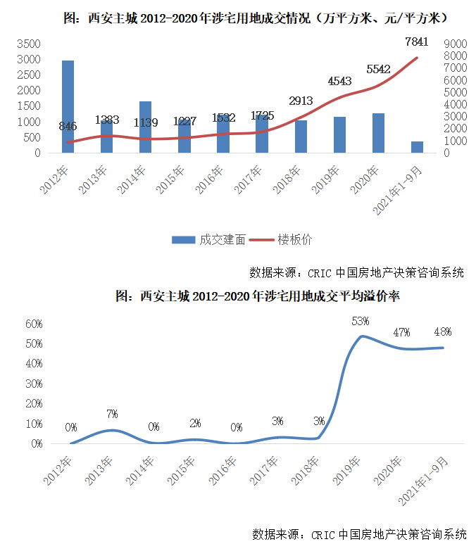 2019年,西安地市全面火爆,房企逢拍必搶,全年涉宅用地平均溢價率高達53%,一改往年宅地底價成交為主的局面,平均樓板價躍升至4543元/平方米。更具里程碑意義的是,西安宅地價格首次邁過“萬元”門檻,城東1宗以及高新4宗地塊成交樓板價每平方米“破萬”,新晉地王高新區(qū)GX3-35-7地塊樓面價高達11182元/平方米。