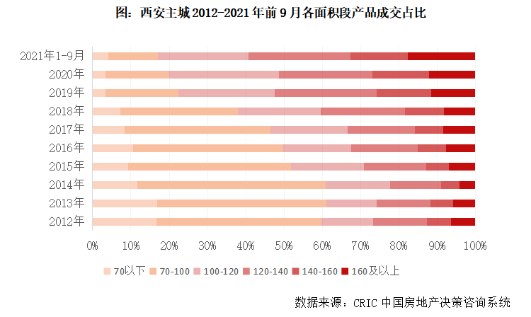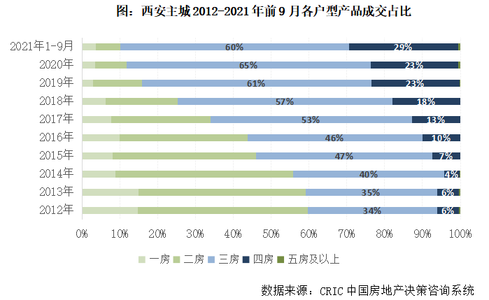 不難發(fā)現(xiàn),西安三房、四房產(chǎn)品成交占比逐年提升,并逐漸占據(jù)絕對主導地位。2015年,三房成交占比首度超過二房,2017年,三房成交占比突破50%,此后穩(wěn)步提升至六成以上。2016年,四房成交占比首次超過10%,到2021年前9月,比重已接近三成。反觀二房產(chǎn)品日漸邊緣化,成交占比由2015年的38%降至2021年的6%。