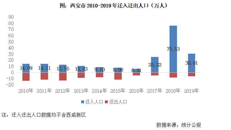 從遷出人口數(shù)據(jù)來看,2010-2015年,西安平均每年遷出10萬人以上,而2016年-2019年,年均僅6萬人遷出,遷出人口規(guī)模顯著下降直觀反映西安城市人口吸附力增強。