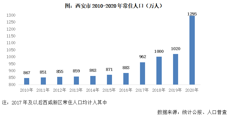 常住人口數(shù)據(jù)同樣可以印證這一結(jié)論,“七普”結(jié)果顯示,截至2020年,西安全市常住人口總量達到1295萬人,較“六普”增加448萬,剔除西咸新區(qū)行政區(qū)劃調(diào)整對人口的影響,十年常住人口增量也超過300萬人。結(jié)合統(tǒng)計年鑒公布的抽樣調(diào)查數(shù)據(jù)來看,常住人口流入主要集中在2017-2020年,前6年年均常住人口增量僅在4萬人左右。