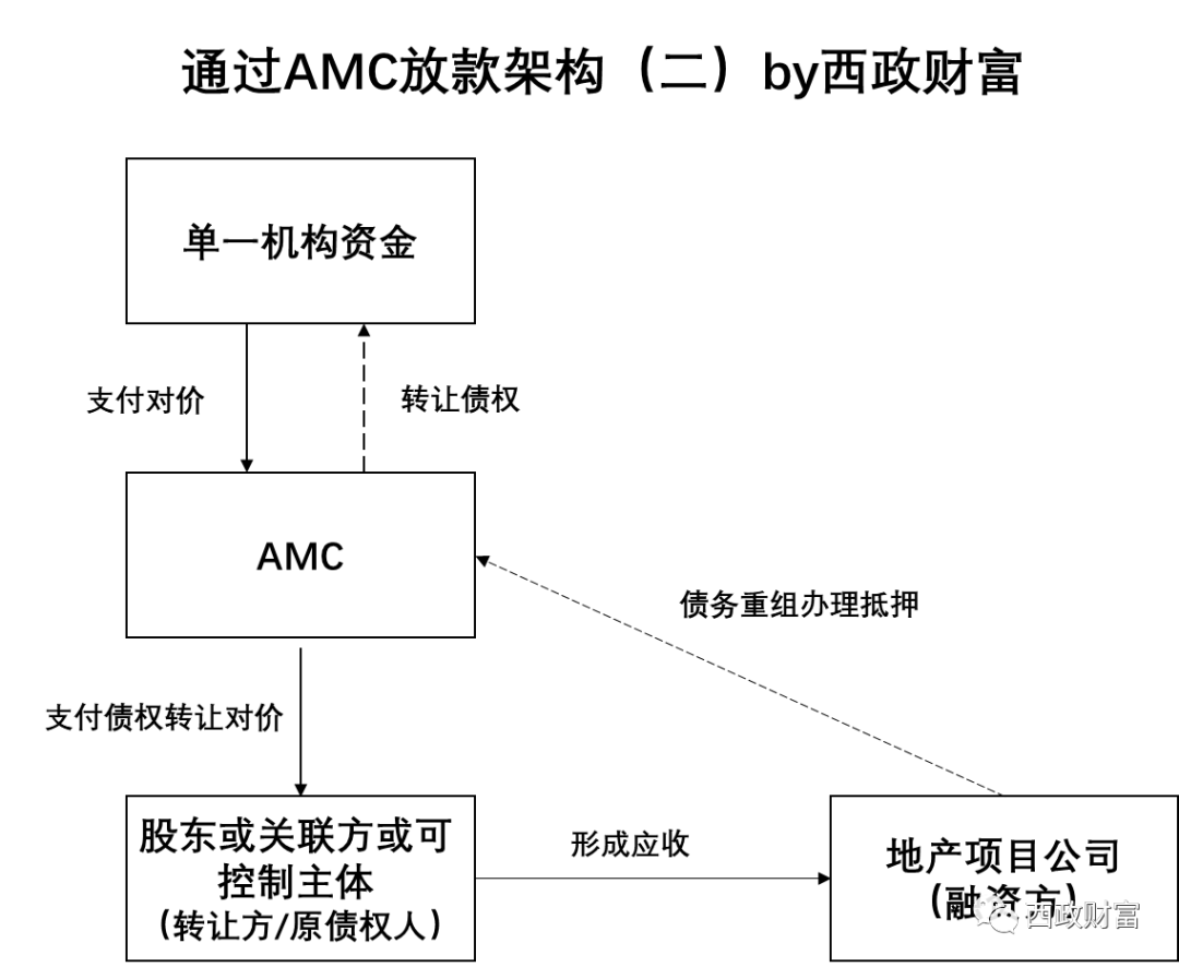 1.通過AMC放款實質為資金方不直接放貸給融資方,而是通過AMC購買融資方作為債務人的債權,債權中附帶抵押權,即可以將AMC理解為類似銀行委貸角色;