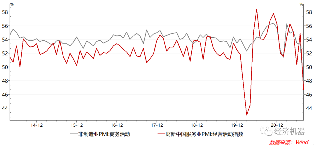 圖2、服務業PMI:官方和財新PMI