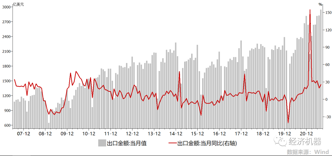 8月份的出口,幾乎成為近期公布的所有數據里的僅有亮色。8月份,出口當月同比增長25.6%,在去年基數逐漸抬升情況下,仍保持加速(圖4);環比上月增長4.1%,再次創出歷史新高。