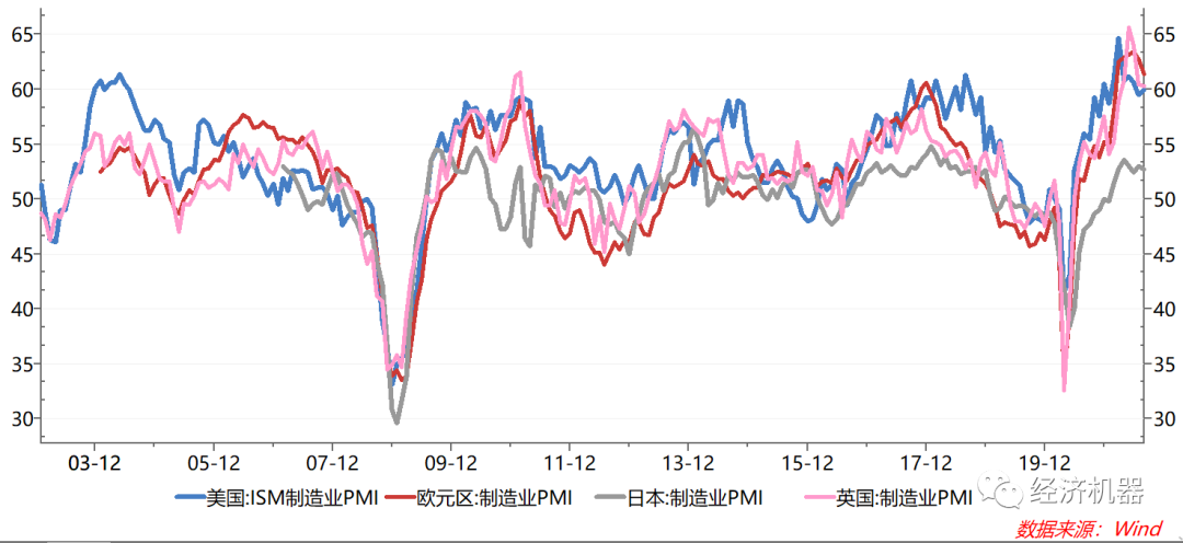 從需求角度看,海外需求的高點或已出現。海外主要經濟體的制造業PMI指數近幾個月均出現了高點回落(圖6),這意味著未來幾個月,其進口增速也將逐漸回落。隨著疫苗注射的推進,供應鏈的恢復,我國出口增速很可能在明年初迎來拐點。