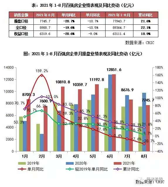 而需求“入冬”,或是壓垮地產商的“最后一根稻草”。8月份,百強企業單月操盤銷售金額下降20.7%,單月環比下降10.7%。剔除去年基數效應,和2019年比,增速也在快速回落(下圖、表)。在融資條件收緊情況下,銷售回款成為"去杠桿”和改善財務狀況的唯一途徑。如果需求快速惡化,則會有一大批民營開發商排隊倒下,清理出局。