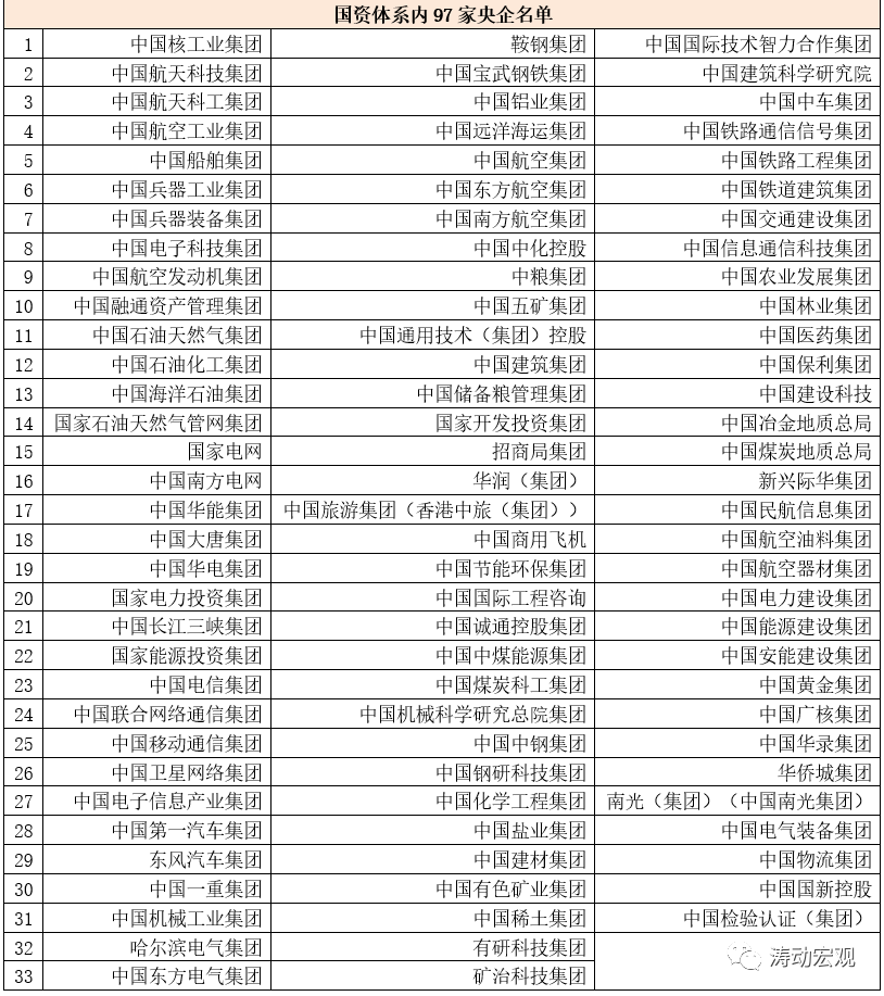 (二)目前國資委體系內(nèi)共有97家央企,具體見下表。