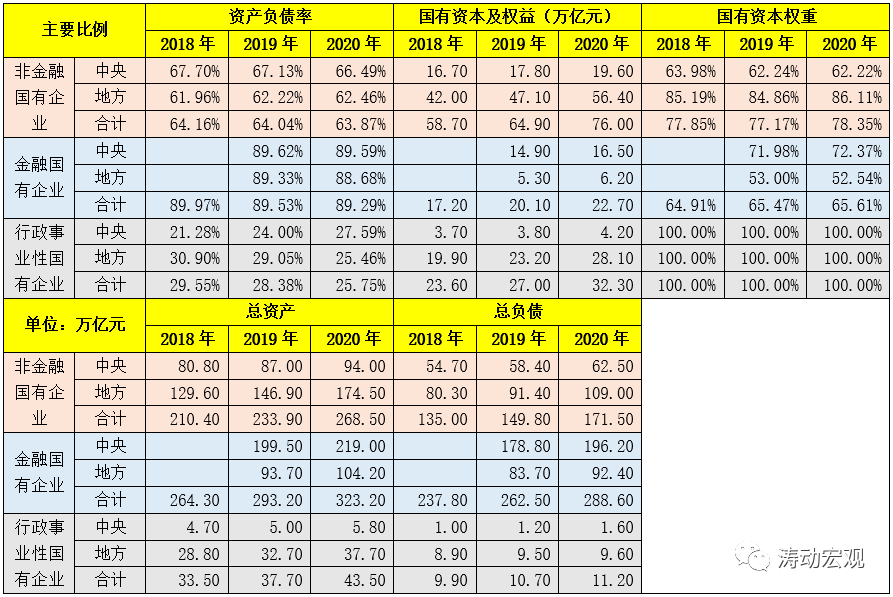 (一)民企和中小企業(yè)是中國經(jīng)濟的活力源泉,而央企則是中國經(jīng)濟的領頭羊。根據(jù)2021年11月公布的《關于2020年度國有資產(chǎn)管理情況的綜合報告》(自2018年以來每年的10月下旬公布當年國有資產(chǎn)管理情況報告)。截至2020年底,非金融國有企業(yè)的總資產(chǎn)和總負債分別為268.50萬億元和171.50萬億元。其中,央企和地方國企的總資產(chǎn)分別為94.00萬億元和174.50萬億元,總負債分別為62.50萬億元和109.00萬億元,資產(chǎn)負債率分別為66.49%和62.46%、國有資本權重分別為62.22%和86.11%。