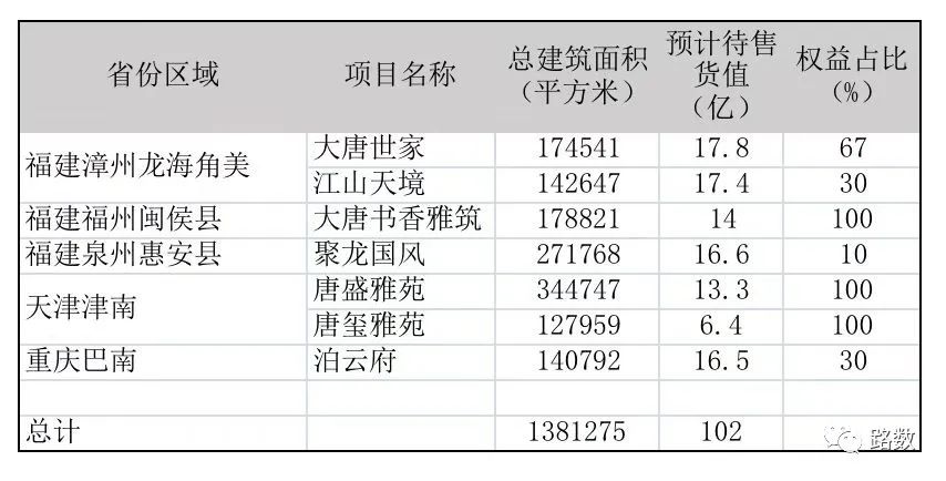 2020年,大唐地產約7成的銷售來自廣西和福建兩省。總項目(不包括零星土儲)102個,其中建筑面積在10萬方以上的項目72個。
