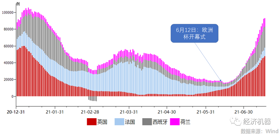過去半年,海外疫情出現(xiàn)反復(fù),印度等局部“淪陷”此起彼伏。但市場情緒整體平穩(wěn),一個隱含的假設(shè)是,隨著疫苗接種持續(xù)推進(jìn),疫情最終會得到控制。但近期,受Delta病毒及美/歐洲杯的影響,一些疫苗接種率高的發(fā)達(dá)國家,新增感染人數(shù)再次猛烈反彈。下圖1顯示,歐洲杯開幕后,幾個足球強(qiáng)國感染人數(shù)飆升,而這幾個國家的接種率大都超過了100%,接近群體免疫標(biāo)準(zhǔn)(120%)。