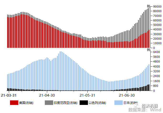 近期,美國,以色列等傳統(tǒng)上認(rèn)為疫苗接種效果最好的國家,疫情也出現(xiàn)再次反彈。人口大國印度尼西亞近期感染人數(shù)出現(xiàn)飆升。日本疫情也出現(xiàn)抬升跡象。東京奧運(yùn)會本周開幕,糟糕的防控水平下,很有可能成為另一個“病毒狂歡節(jié)”。此外,種種跡象表明,海外疫情再次惡化的概率在提升。“疫苗信仰”是當(dāng)前支撐經(jīng)濟(jì)和市場預(yù)期的一個核心邏輯,這一信仰一旦被打破,或?qū)︼L(fēng)險資產(chǎn)價格造成一波沖擊。