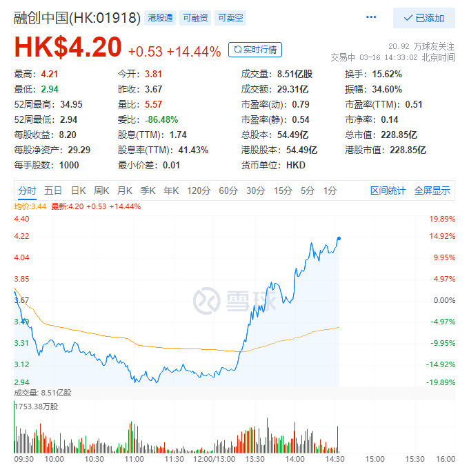 典型的如融創中國,上午還下跌了19個點,下午就一路攀升上漲到14個點,一天之內劇烈震蕩33個點。接下來,中國的房地產市場,也會如此V型反轉嗎?