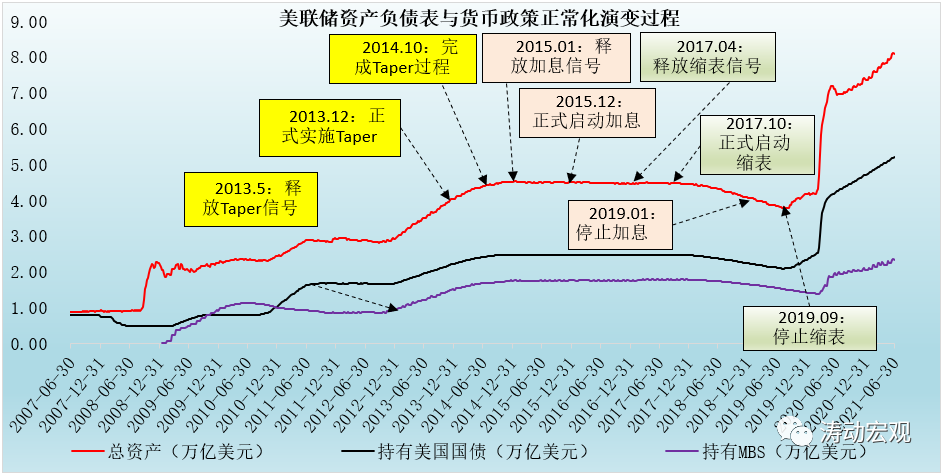 前面已經指出,美聯儲的貨幣政策正常化路徑基本上遵循“向市場釋放Taper信號——Taper過程——向市場釋放加息信號——加息——向市場釋放縮表信號——正式縮表”的邏輯脈絡。