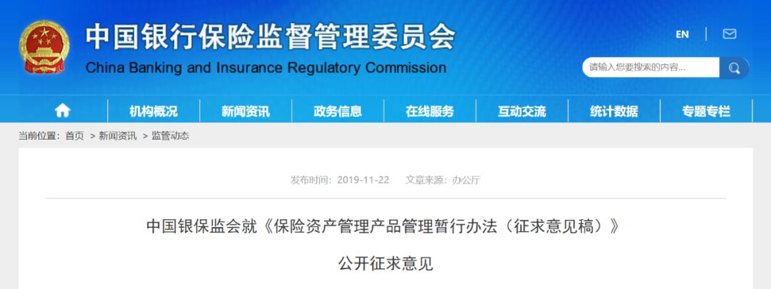 2019年11月22日,銀保監會發布《保險資產管理產品管理暫行辦法(征求意見稿)》第二十條規定,保險資管產品可以投資于國債、地方政府債券、中央銀行票據、政府機構債券、金融債券、銀行存款、大額存單、同業存單、公司信用類債券,在銀行間債券市場或者證券交易所市場等經國務院同意設立的交易市場發行的證券化產品,公募證券投資基金、其他債權類資產、權益類資產和銀保監會認可的其他資產。保險資金投資的保險資管產品,其投資范圍應當符合保險資金運用的有關監管規定。