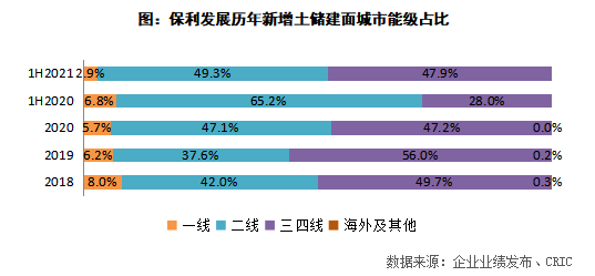 從城市布局來看,保利上半年減少了集中供地城市的拿地,重點22城的拿地建面占比同比下降了20個百分點至34%,將投資重點在三四線,三四線新增容積率面積同比增長了113.7%,占比達到47.9%,增幅有19.9個百分點,其中,珠三角區域的茂名、佛山、汕尾、清遠位居拿地建面TOP10城市。三四線城市拿地占比的提升,也使得保利2021年上半年的拿地均價同比下降了30.0%至5833元/平方米。