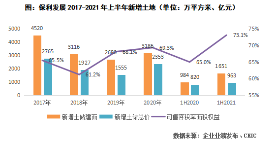 2021年上半年保利發展新增項目84個,新增計容建筑面積達到1651萬平方米,拓展成本963億元,分別同比增長67.8%和17.4%,金額比為0.34,高于TOP10房企的0.30,拿地銷售面積比達到0.99。