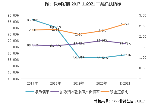 從債務結構來看,現金短債比2.59,長短債比4.56,分別較2020年末增加0.33和 0.96,債務結構持續優化;現金覆蓋短債,債務結構穩定健康。2021上半年末保利有息債同比增加378億元,凈負債率增2.18個百分點至58.73%,若將永續債計做負債,則凈負債上升0.64個百分點至70.00%,扣除預收后的資產負債率67.71%,較期初下降2.24個百分點。
