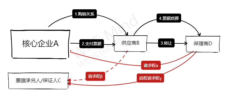在簡(jiǎn)單模型中,供應(yīng)商B僅以應(yīng)收賬款α向保理商申請(qǐng)保理融資,并未將票據(jù)背書(shū)轉(zhuǎn)讓給保理商D,此時(shí)為確保保理商D的權(quán)利可以延及票據(jù),供應(yīng)商B將票據(jù)質(zhì)押給保理商D,擔(dān)保的主債權(quán)可能債權(quán)α,也可能是供應(yīng)商B在保理合同項(xiàng)下的各項(xiàng)義務(wù)或承諾(包含回購(gòu)義務(wù))。