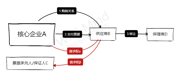 為什么“先票后保”會(huì)成為一種創(chuàng)新的融資模式呢?因?yàn)閷?duì)于資金方(簡(jiǎn)單模式指保理商,資產(chǎn)證券化模式指投資人)來(lái)講,它的信用主體從原來(lái)的應(yīng)收賬款債務(wù)人增加甚至部分轉(zhuǎn)移至了票據(jù)債務(wù)人。通常情況下,票據(jù)承兌人/保證人C為信用等級(jí)更優(yōu)的主體,例如核心企業(yè)A的集團(tuán)母公司或關(guān)聯(lián)方,因?yàn)闄?quán)利順位的存在,票據(jù)請(qǐng)求權(quán)β往往是優(yōu)先被實(shí)現(xiàn)的,這無(wú)疑減少了信用風(fēng)險(xiǎn),在資產(chǎn)證券化過(guò)程中增加了產(chǎn)品安全性。