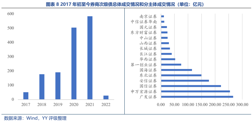 券商次級債整體規模不大,較為小眾,但在結構性資產荒背景下一度受到熱捧,成交額自2020年以來大幅提升。