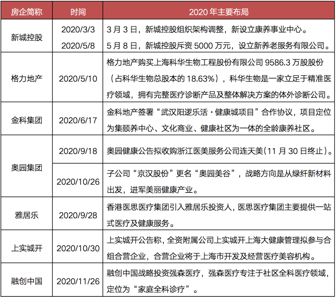 表:2020年房企在大健康賽道的主要新布局