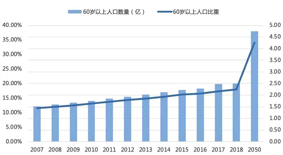 圖:2007-2018年中國(guó)60歲以上人口數(shù)量及比重