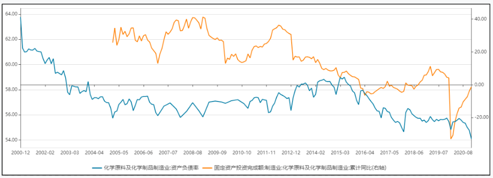 圖5  化工行業(yè)投資與行業(yè)資產(chǎn)負(fù)債率對比(單位:%)
