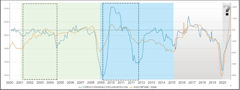 化工行業(yè)作為周期性行業(yè),分析其行業(yè)景氣度的方式很多,本文以業(yè)內(nèi)虧損企業(yè)家數(shù)同比變動作為行業(yè)周期分析視角擬合化工行業(yè)景氣度,通過與宏觀經(jīng)濟(jì)一致指數(shù)對比,進(jìn)一步驗(yàn)證了這一指標(biāo)對行業(yè)景氣度擬合的可靠性。