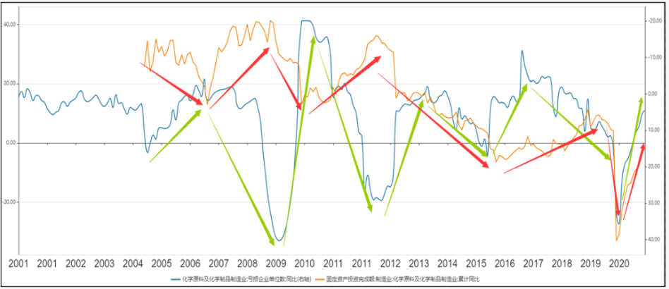 可以簡單梳理其中邏輯:國內(nèi)化工行業(yè)以中低端基礎(chǔ)化工為主,行業(yè)產(chǎn)能相對過剩,因此資本的進(jìn)入很容易加劇行業(yè)競爭進(jìn)而影響行業(yè)景氣度。具體表現(xiàn)為,迅速增加的供給能力無法與市場需求匹配,導(dǎo)致行業(yè)階段性過剩,企業(yè)盈利能力隨之下降,虧損企業(yè)數(shù)量增加,同時,預(yù)示著行業(yè)景氣度下行。而行業(yè)景氣的下行會逐漸打消潛在資本的進(jìn)入欲望,直至行業(yè)景氣度的低谷,資本對行業(yè)的投入便不再增加并在之后逐步減少。隨著市場需求增長,市場逐步消化既有產(chǎn)能,供需關(guān)系逐步改善,行業(yè)景氣度從低谷上行。