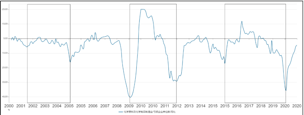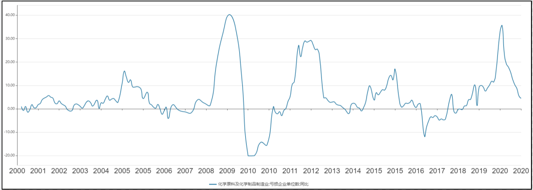 經(jīng)過對多年數(shù)據(jù)分析,雖然每家化工企業(yè)經(jīng)營情況各有不同,但在相對充分市場化競爭的格局下,徘徊在盈虧邊緣化企的變化更能敏感的反映行業(yè)景氣度變動,因此,我們可以用化工行業(yè)虧損企業(yè)家數(shù)同比的變化較為直觀的反映行業(yè)的興衰。我們通過對國家統(tǒng)計局公布的近二十年化學(xué)原料及化學(xué)制造業(yè)虧損企業(yè)家數(shù)同比數(shù)據(jù)進(jìn)行整理,繪制出圖1。在圖中可以清晰的看出近二十年國內(nèi)化工企業(yè)虧損數(shù)量在不同時期波動差異較大,同時,也反映出我國化工行業(yè)近二十年行業(yè)景氣度大幅波動的現(xiàn)狀。