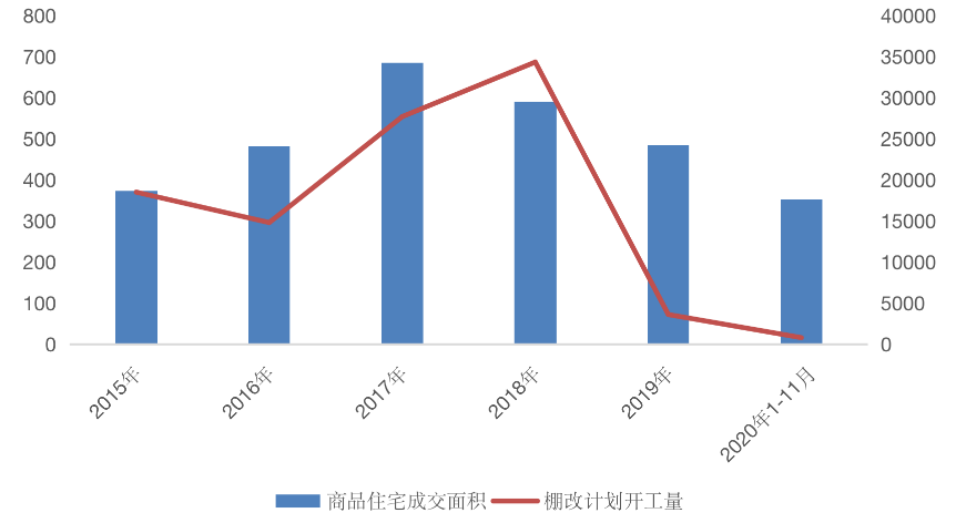 至2019年,煙臺棚改計劃開工量跌至3607套,同比驟降89%,2020年計劃開工量進一步回落至792套,同比再降78%。與之相對應的是,2020年煙臺房地產市場下行壓力加劇,1-11月累計成交352萬平方米,同比仍降18%。