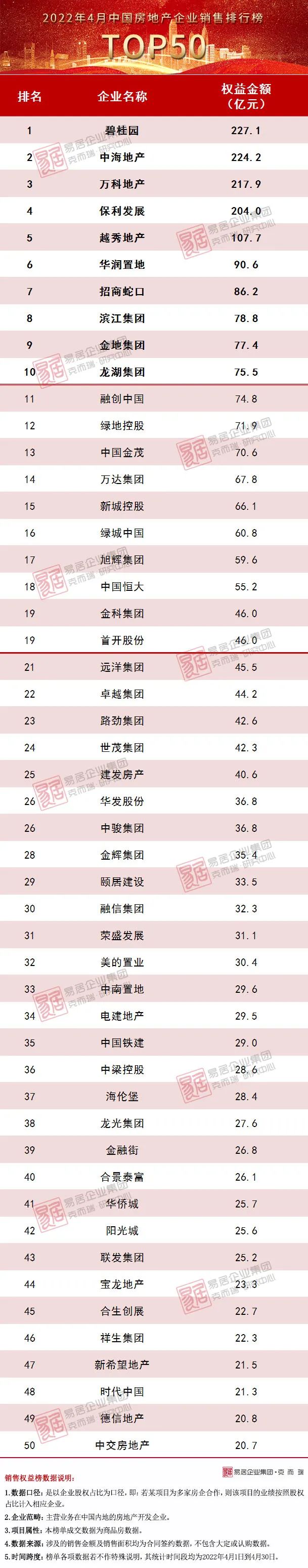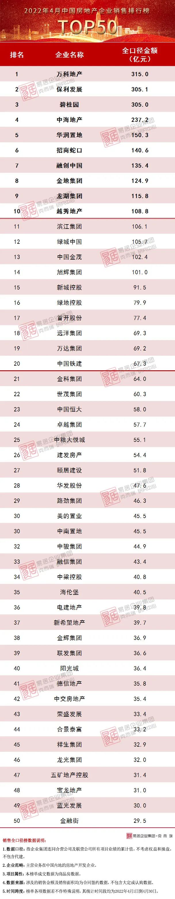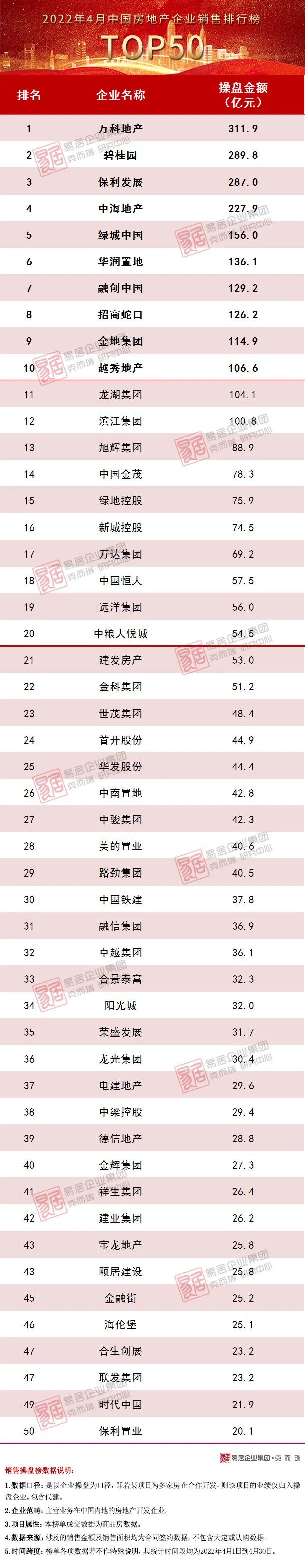 附:2022年4月中國房地產企業TOP50銷售排行榜