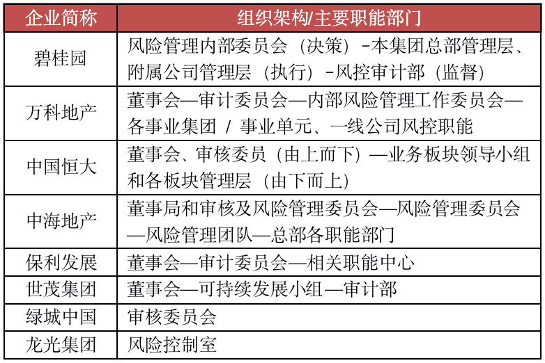 表:典型房企風(fēng)險(xiǎn)管理組織架構(gòu)/主要職能部門