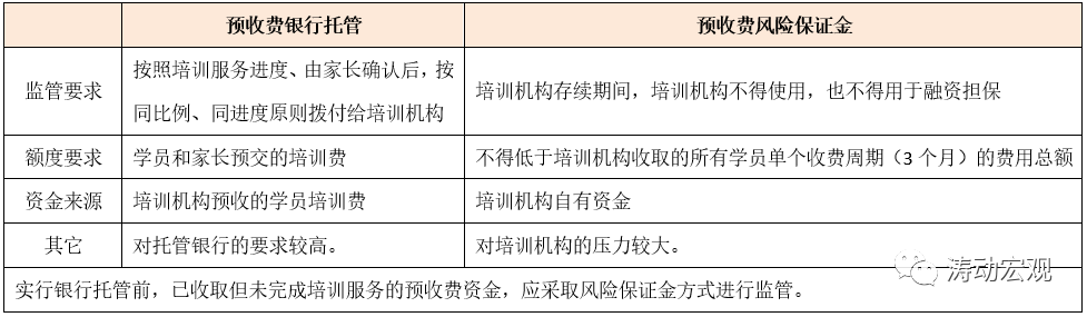 為避免出現(xiàn)“退費(fèi)難、卷錢跑路”等情況,2號文提出通過銀行托管和風(fēng)險(xiǎn)保證金兩種方式實(shí)行預(yù)收費(fèi)監(jiān)管。這兩種方式各地可以根據(jù)實(shí)際情況自主選擇。