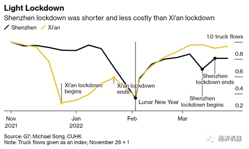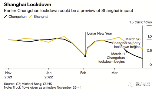 據(jù)香港中文大學(xué)宋錚團(tuán)隊(duì)對(duì)疫情影響的量化分析顯示,在3月28日“定向封控”之前,上海此輪防疫限制導(dǎo)致經(jīng)濟(jì)活動(dòng)較正常情況下降40%。相比之下,吉林長(zhǎng)春的封控已經(jīng)導(dǎo)致經(jīng)濟(jì)活動(dòng)水平下滑66%以上。