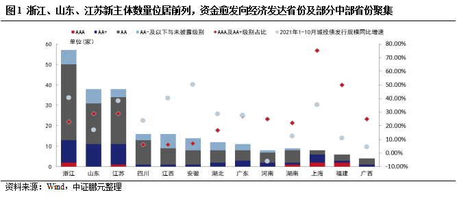 浙江、山東、江蘇、廣東等經濟發展水平較高及部分中部省份新主體數量靠前,市場資金愈發向這些區域聚集。近年國家對于規范城投公司融資政策密集出臺,但地方的建設投入、存量債務償還等資金需求依然很大,在此背景下,更多的城投公司在資本市場上首次亮相,以此來擴寬融資渠道或降低融資成本等,2021年1-10月,全國新增發債城投公司(以下簡稱“新主體”)共260家,浙江、山東、江蘇新主體數量位居前三,四川、江西、安徽、湖北、廣東的新主體也較多,以上區域也是同期城投債發行規模增速靠前的省份,市場資金愈發向這些區域聚集。