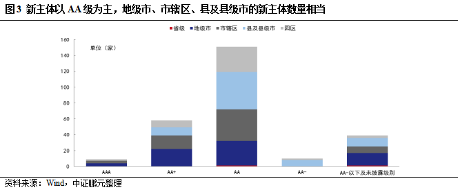 新主體的級別與層級分布方面,新主體以AA級平臺為主,達到147家, AAA與AA+的高級別主體數量較少,合計僅65家,地級市、市轄區、縣及縣級市的新主體數量相當,另外新增的園區平臺達到48家。