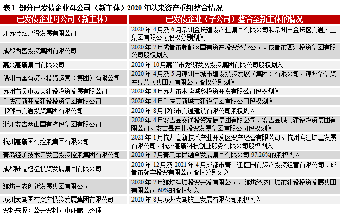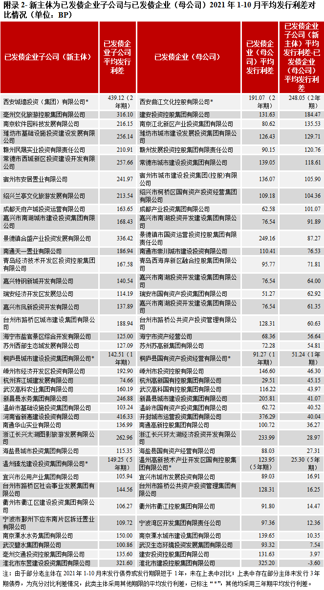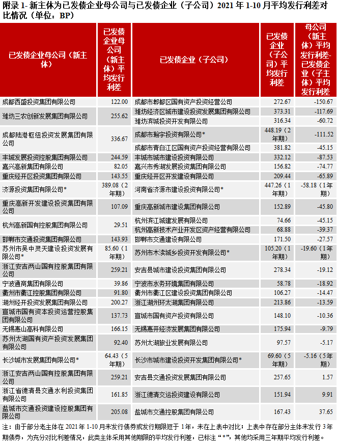 通過梳理已發債企業母公司的新主體,雖有部分平臺為資產整合時間較長的首次發債主體,同時也有較多為2020年以來才進行資產整合的主體,部分整合情況如下表所示,另外,我們也對比新老主體中母子公司的級別情況,已發債企業母公司(新主體)的級別高于已發債企業(子公司)有19家,占比較高,達50.00%。從已發債企業母公司(新主體)與已發債企業(子公司)的2021年1-10月平均發行利差[4]對比情況來看(詳見附錄一),絕大部分的已發債企業母公司(新主體)平均發行利差相比已發債子公司有所收窄,成都西盛投資集團有限公司、濰坊三農創新發展集團有限公司、成都陸港樞紐投資發展集團有限公司、嘉興高新集團有限公司等近期整合的新主體,相比已發債子公司的平均利差收窄幅度靠前,融資成本有所下降。