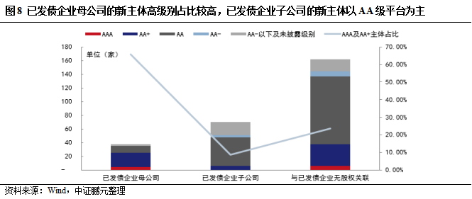 從新主體與已發債企業的股權關系來看,新主體為已發債企業的母公司共38家,此類新主體中高級別平臺占比較高,AAA及AA+主體數量分別為4家和21家,合計占比達65.79%;新主體為已發債企業的子公司共70家,其中AA+主體僅6家,以AA主體為主,達42家,且存在較多AA-以下及未披露級別的主體,達19家;大多數新主體與已發債企業無股權關系,此類新主體以一級平臺為主,一級平臺占比達到90%以上。