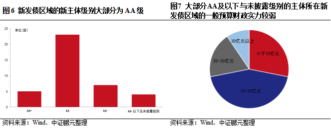 新發債區域基本為市轄區、縣及縣級市,大部分區域一般預算財政實力較弱,新發債區域的新主體級別大部分為AA級,另外有較多為AA-及以下與未披露級別的平臺