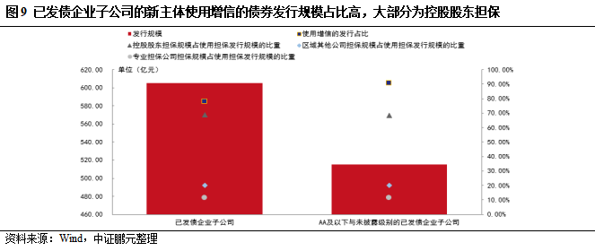 部分新主體為已發債企業的母公司,并較多進行了資產整合,另外有較多的已發債企業子公司登陸資本市場融資,雖大部分已設置增信擔保,但基本上融資成本相比母公司仍較高。已發債企業的母公司的新主體中高級別主體數量占比較高,較多主體進行了資產整合,級別相對子公司有所提升,融資成本有所下降;已發債企業子公司的新主體以AA級平臺為主,大部分主體相比于母公司級別更低,且使用增信的債券發行規模占比高,但基本上相比于母公司發債的融資成本仍較高,由于擴寬融資渠道、提高金融機構對其認可程度等方面因素,仍有較多的已發債企業子公司登陸資本市場融資。