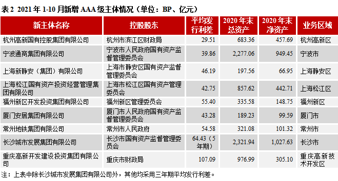 我們也聚焦高級別的新主體,2021年1-10月,新增的AAA級主體共9家,均為經濟發展水平靠前區域的一級平臺,其中包括杭州高新國有控股集團有限公司、重慶高新開發建設投資集團有限公司(以下簡稱“重慶高新”)這些整合區域內資產后首次發債的園區平臺;AAA級已發債企業母公司的寧波通商集團有限公司、長沙城市發展集團有限公司以及國家級新區平臺福州新區開發投資集團有限公司等,除重慶高新三年期平均發行利差達到107.09BP,其他AAA級新主體的平均發行利差較低。