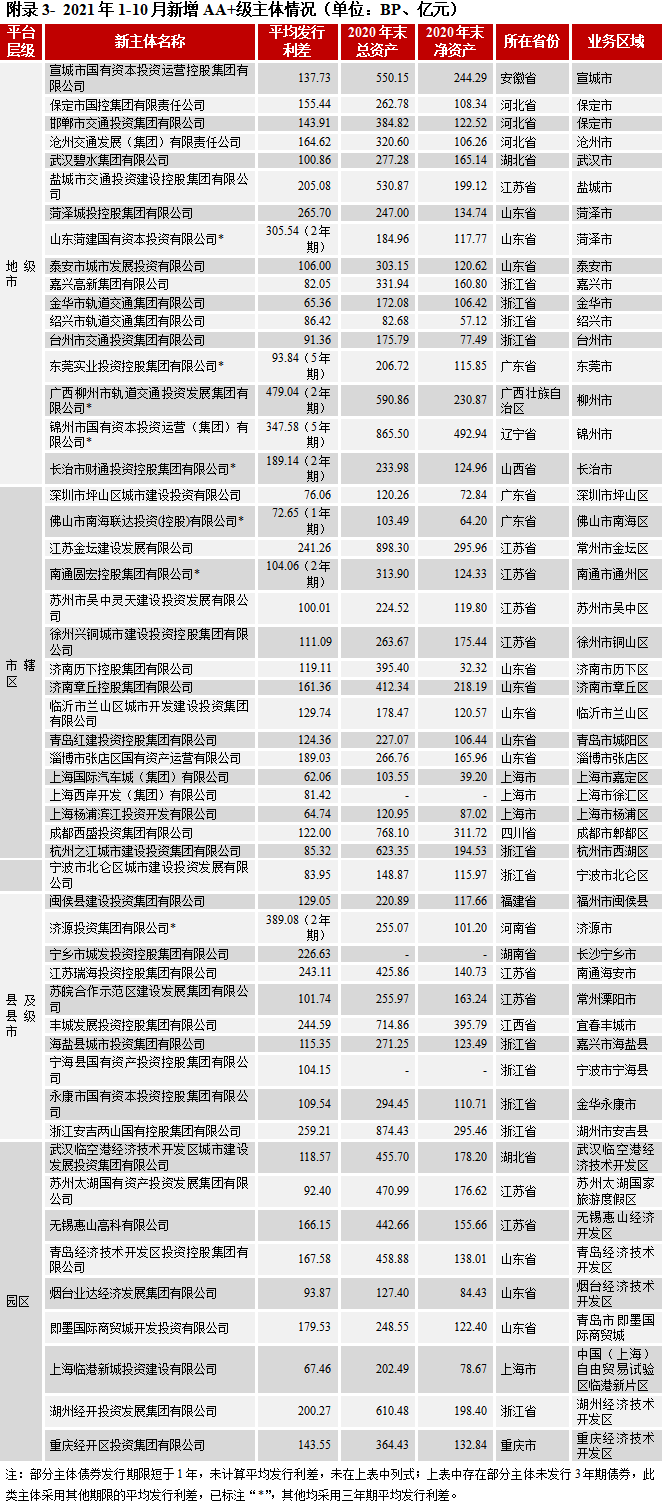 AA+新主體方面,2021年1-10月新增AA+主體共56家,其中浙江、山東、江蘇、上海、廣東、分別為11家、11家、10家、4家、3家,其他省份均少于3家,從平臺層級來看,地級市、市轄區、縣及縣級市、園區類AA+新主體分別為20家、17家、10家和9家;市轄區AA+新主體主要分布在山東、江蘇、浙江、廣東這些省份中經濟靠前的地級市的市轄區以及上海市嘉定區和徐匯區;新增的縣及縣級市AA+主體則主要分布在浙江和江蘇,福建閩侯縣,江西豐城市、湖南寧鄉市、河南濟源市各有1家AA+新平臺;園區的AA+新主體則基本上分布在經濟較為發達城市的園區(詳見附錄3)。