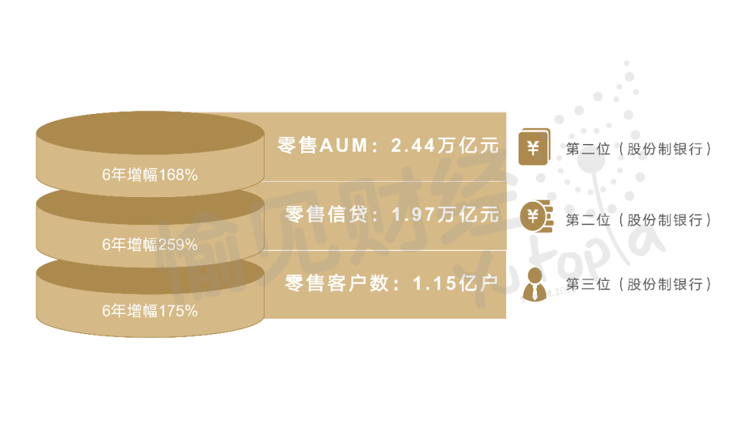 換個角度,再看發展勢能。6年前中信銀行提出零售的“四三三”戰略,已經帶動了零售基底完成了“助跑”階段,勢頭明顯:零售AUM,6年增幅168%,亦即年復合增速17%;零售客戶數,6年增幅175%;零售信貸余額,6年增幅259%,年復合增速更是高達23%。