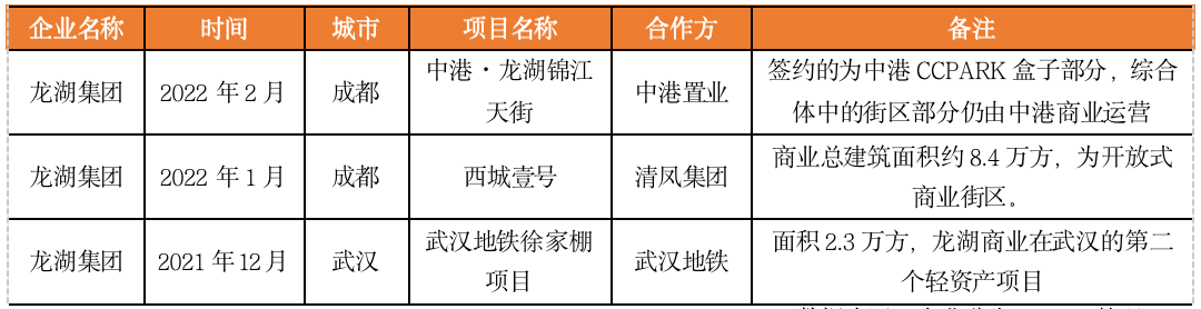 早在2020年龍湖集團旗下的龍湖智慧服務集團就已經在試水“商業輕資產”管理輸出業務,簽約珠海融德廣場和南寧昭陽廣場,兩個項目均以“純管理輸出”方式,不涉“品牌輸出”,但當前龍湖進行輕資產簽約仍較為謹慎。