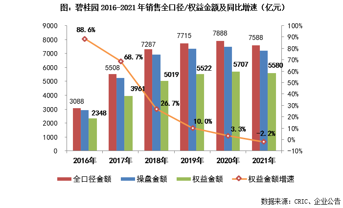 2021年,碧桂園連同合營及聯營公司累計實現歸屬于母公司股東權益的合同銷售金額5580億元,合同銷售面積6641萬平方米,均價8402元/平方米。